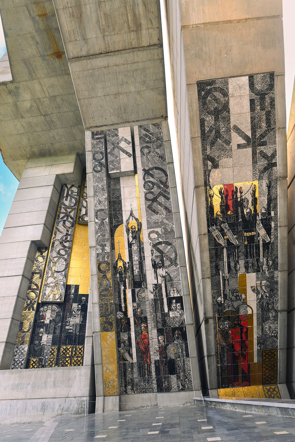 Срещу скулптурата на цар Симеон и неговите приближени се откроява мозайка, разделена на три основни пана. На първото има рунически текст, със знак на българския езически бог Тангра, на второто е изписана глаголицата, а на третото – кирилицата. Мозайката е дело на Владислав Паслакев и Симеон Венов.